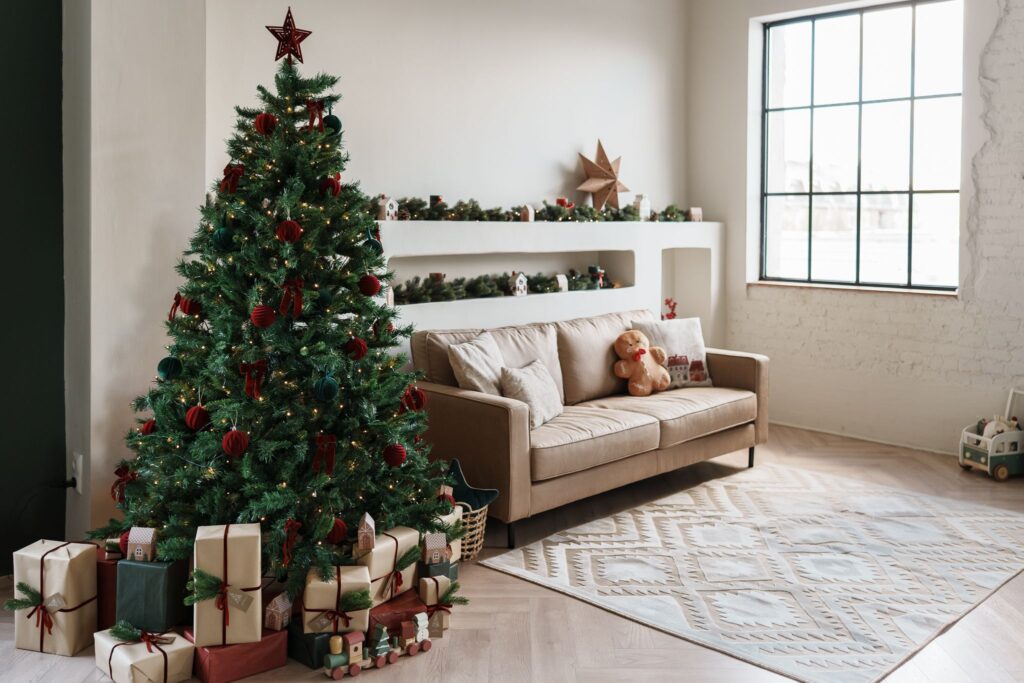 Klasszikus karácsonyi hangulat: mélyzöld és piros színek, meleg fényű égősorokkal, gazdagon feldíszített karácsonyfával.